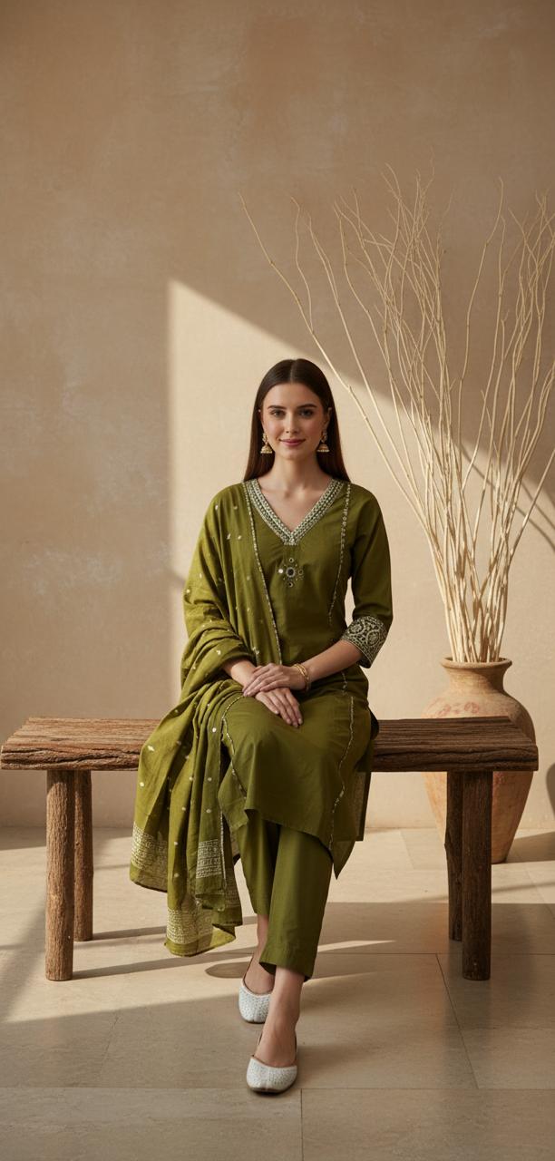 Apne wardrobe ko ek royal touch dein is exquisite Mul Cotton Suit Set ke saath. Ye set comfort aur traditional craftsmanship ka ek behtareen combination hai, jo har occasion par aapko standout dikhayega.