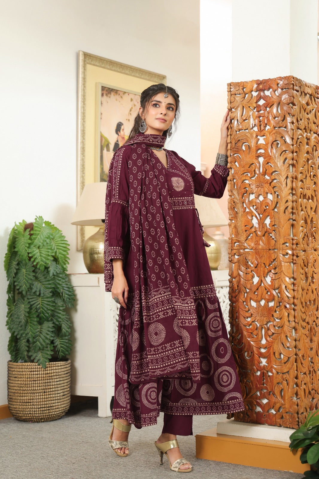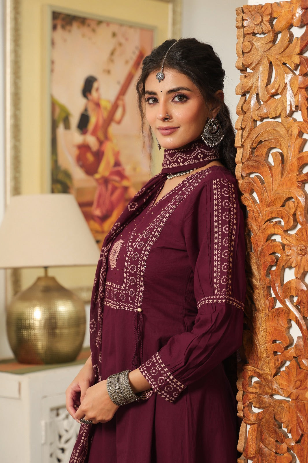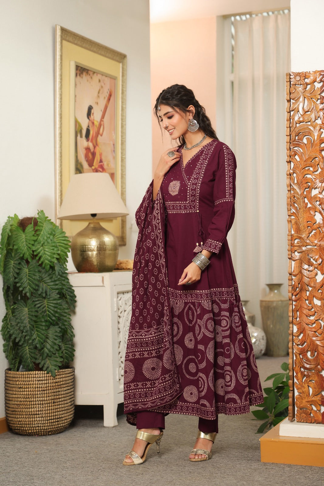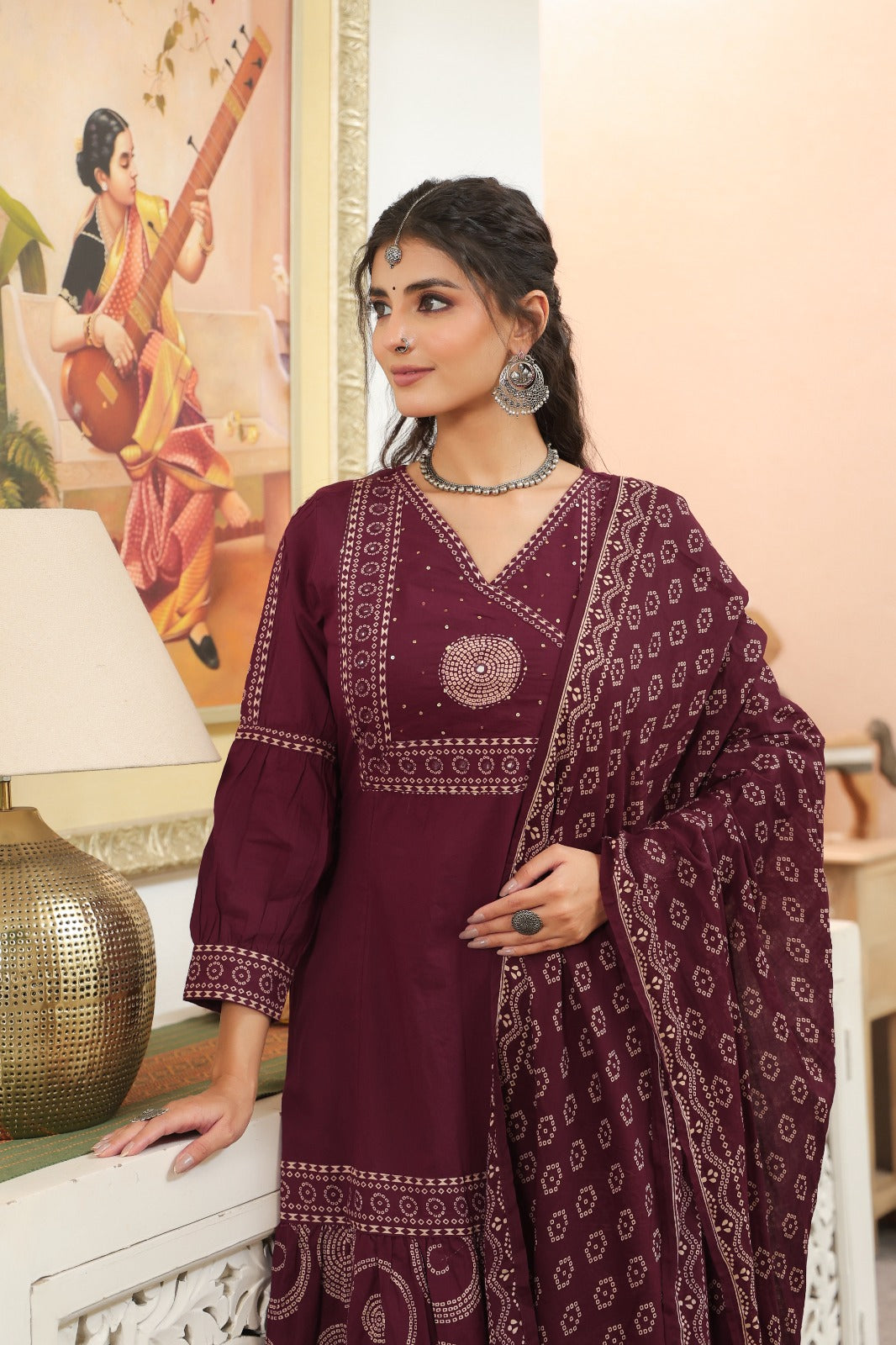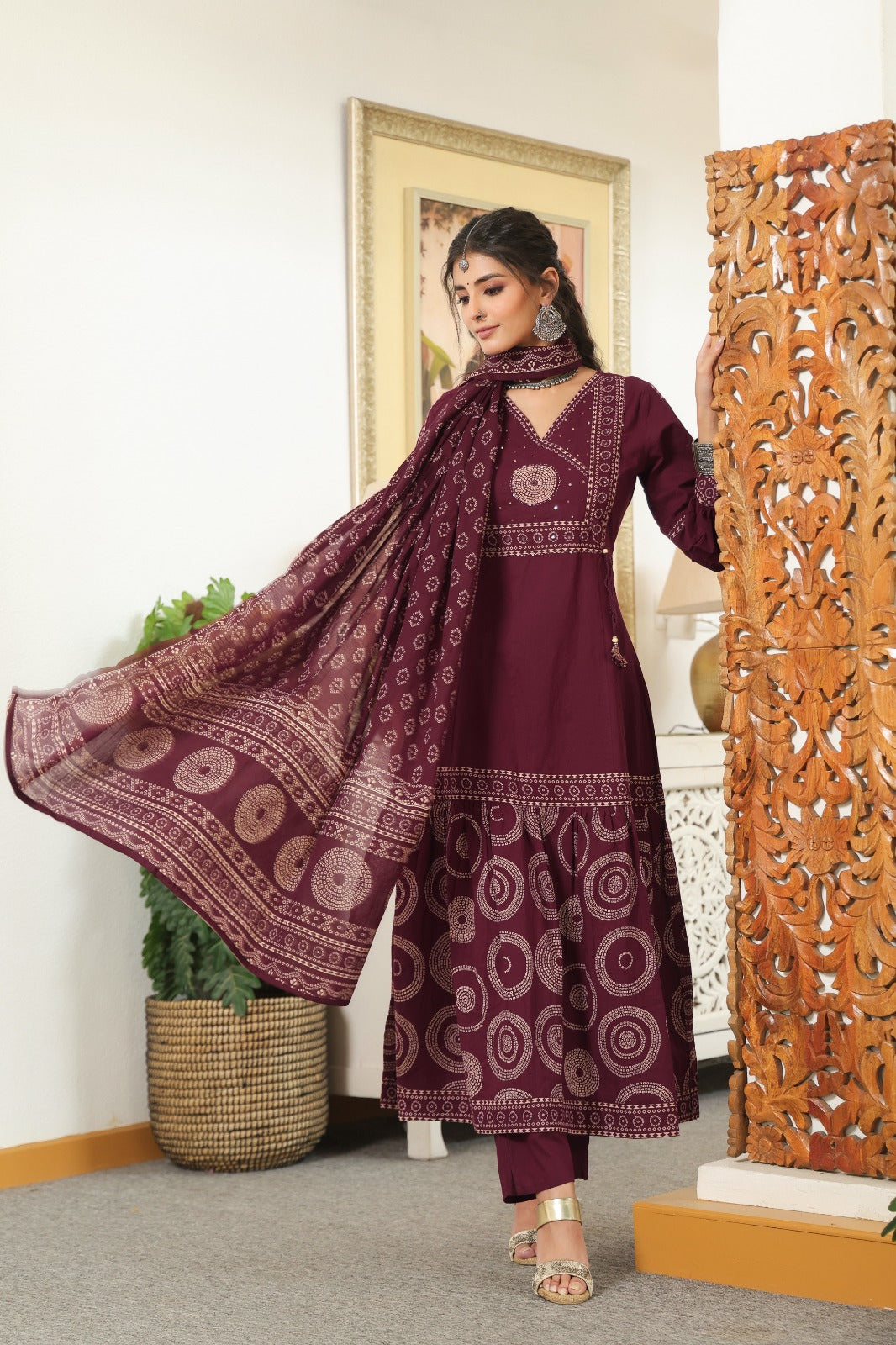 Experience the perfect blend of tradition and comfort with this exquisite Maroon Anarkali set. Crafted from buttery-soft Mul Cotton, this outfit is designed for all-day breathability and ease. The kurta features a flattering V-neckline with delicate border detailing and flares out beautifully with bold, circular ethnic motifs.