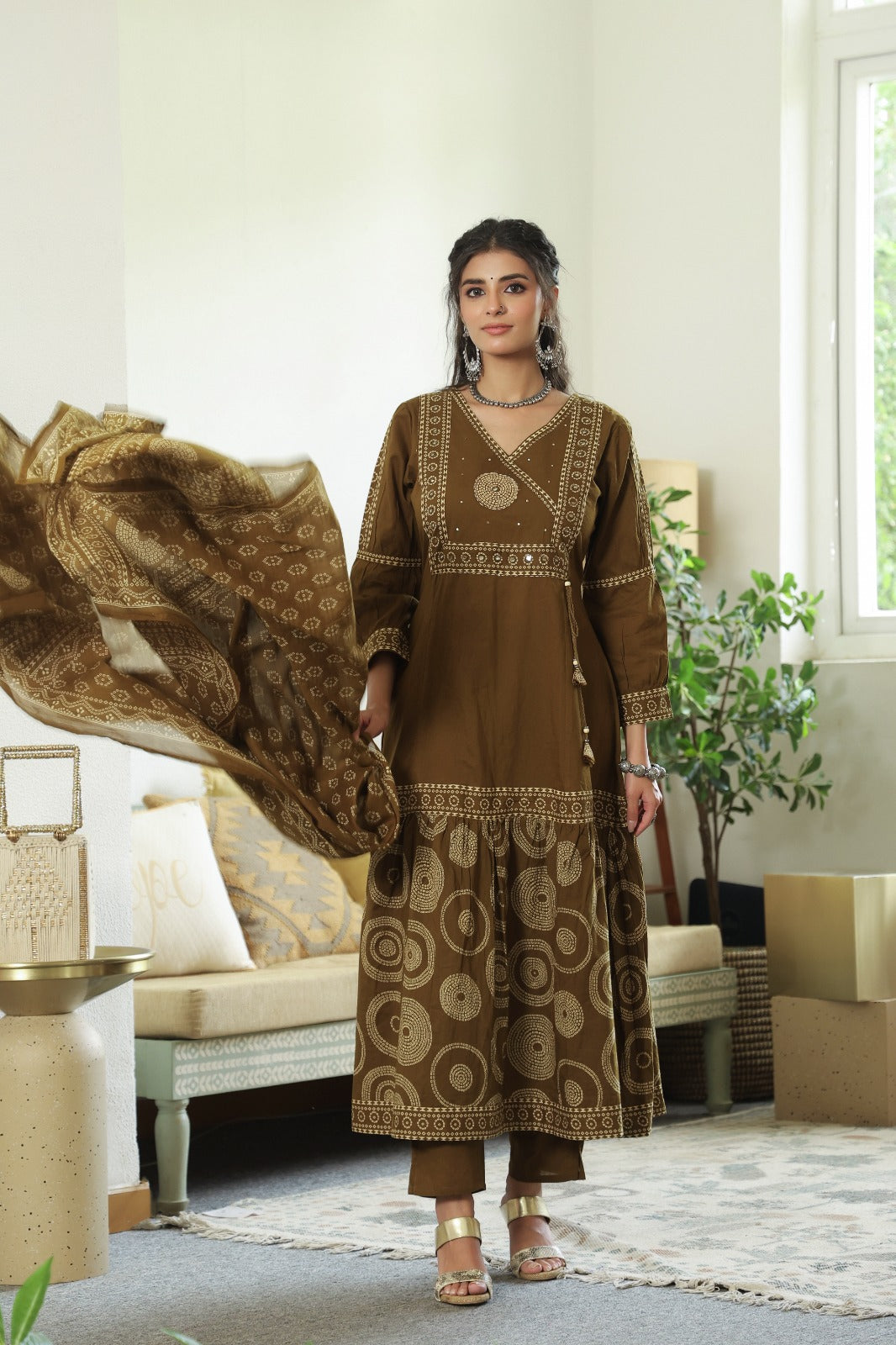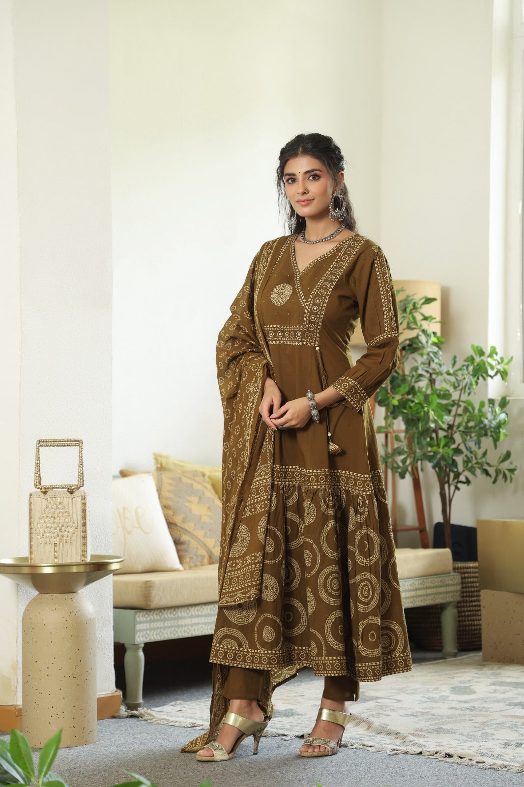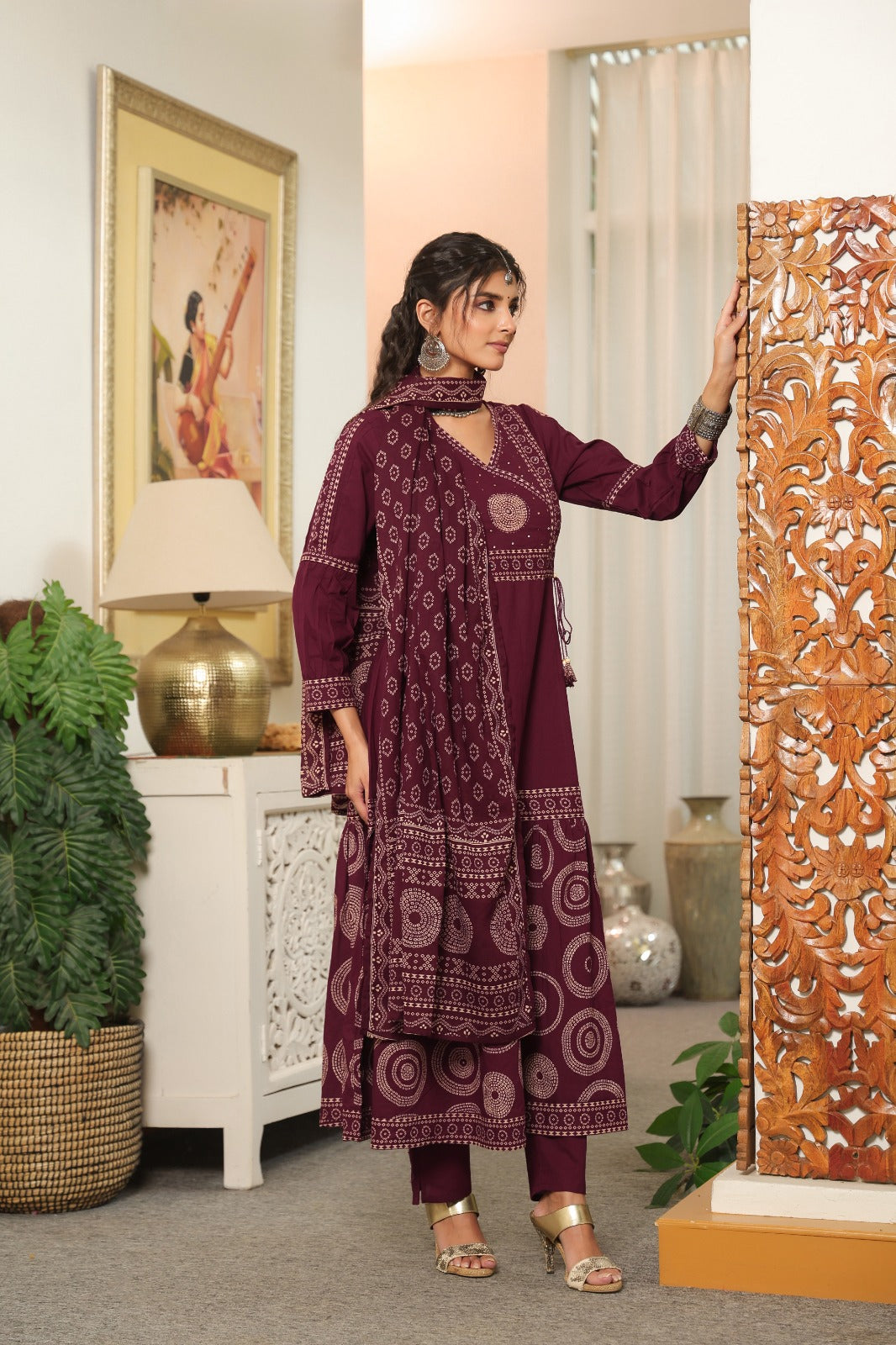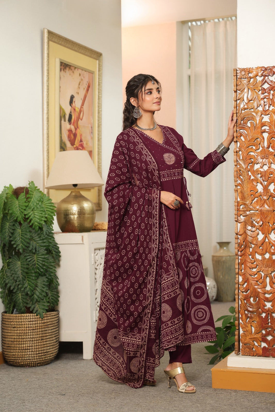 Experience the perfect blend of tradition and comfort with this exquisite Maroon Anarkali set. Crafted from buttery-soft Mul Cotton, this outfit is designed for all-day breathability and ease. The kurta features a flattering V-neckline with delicate border detailing and flares out beautifully with bold, circular ethnic motifs.