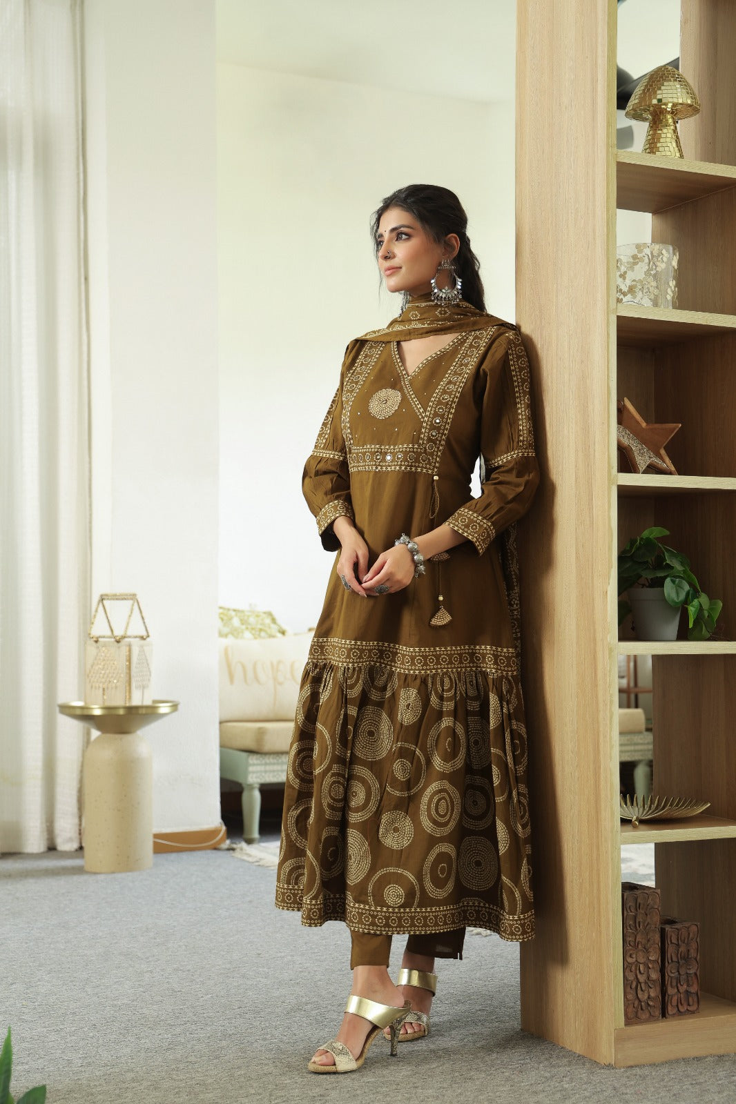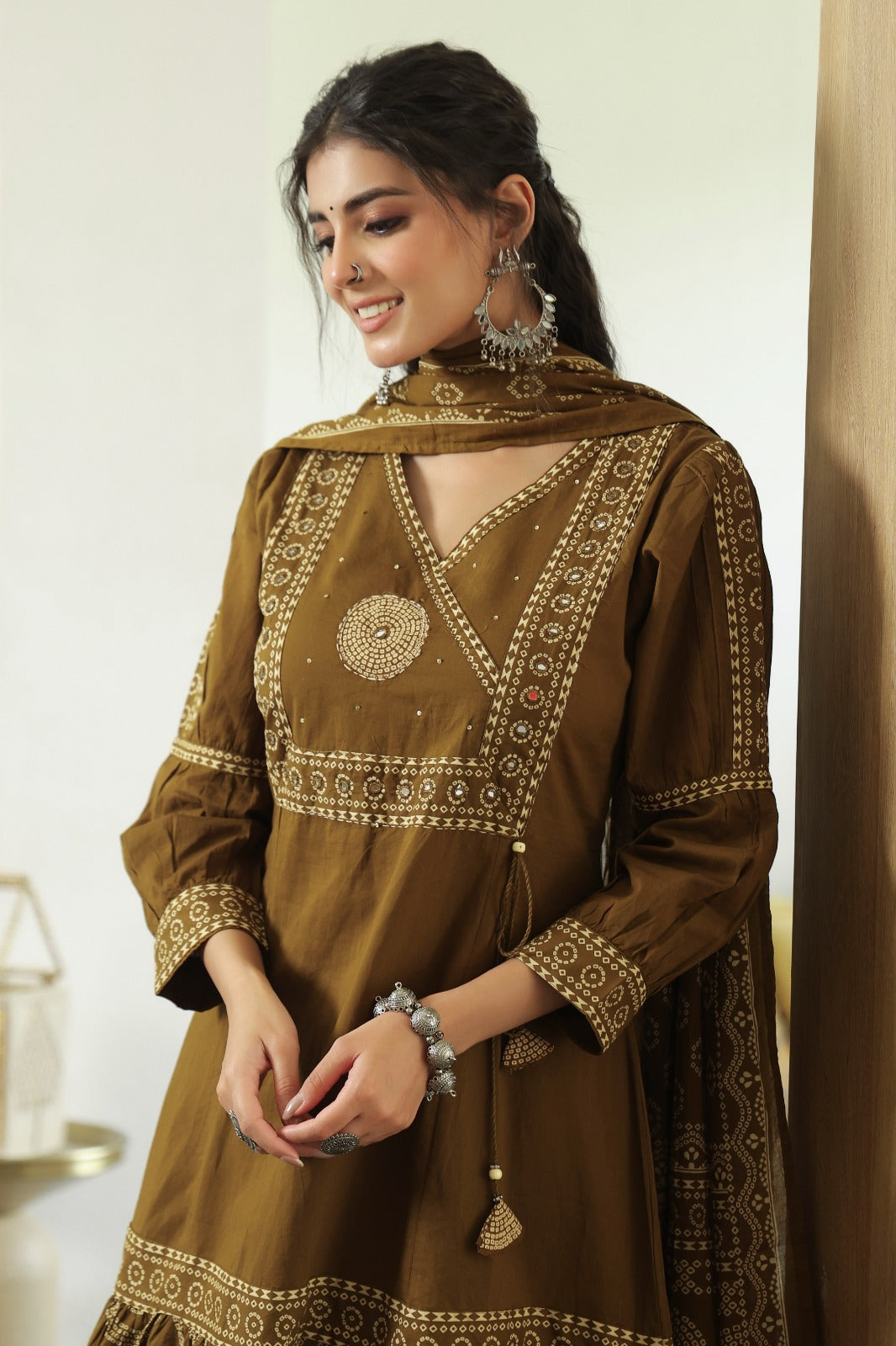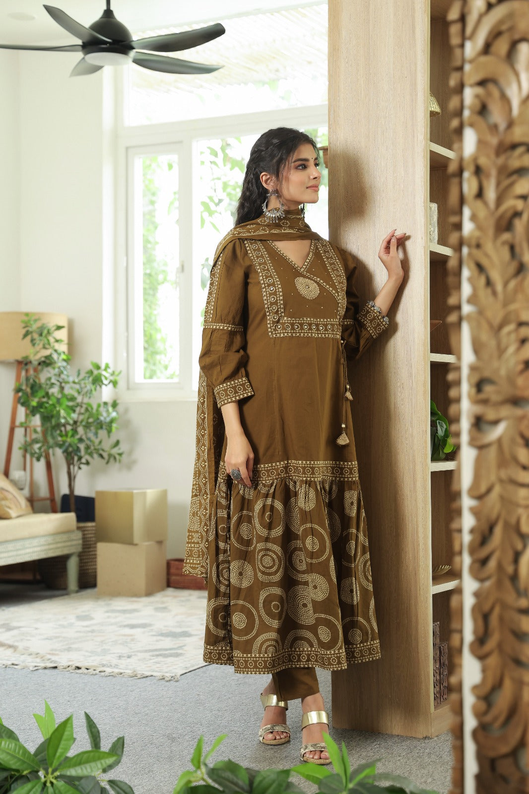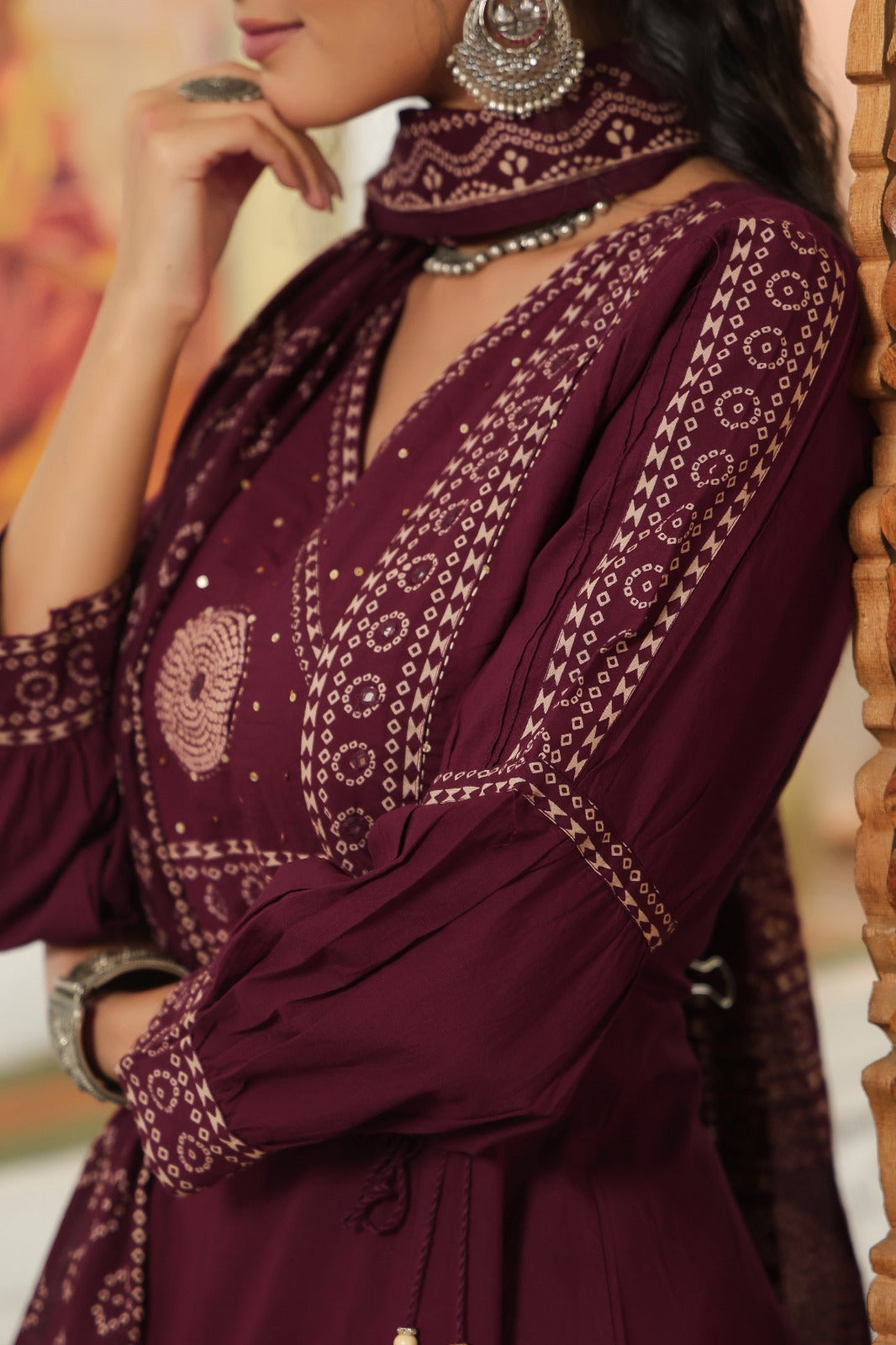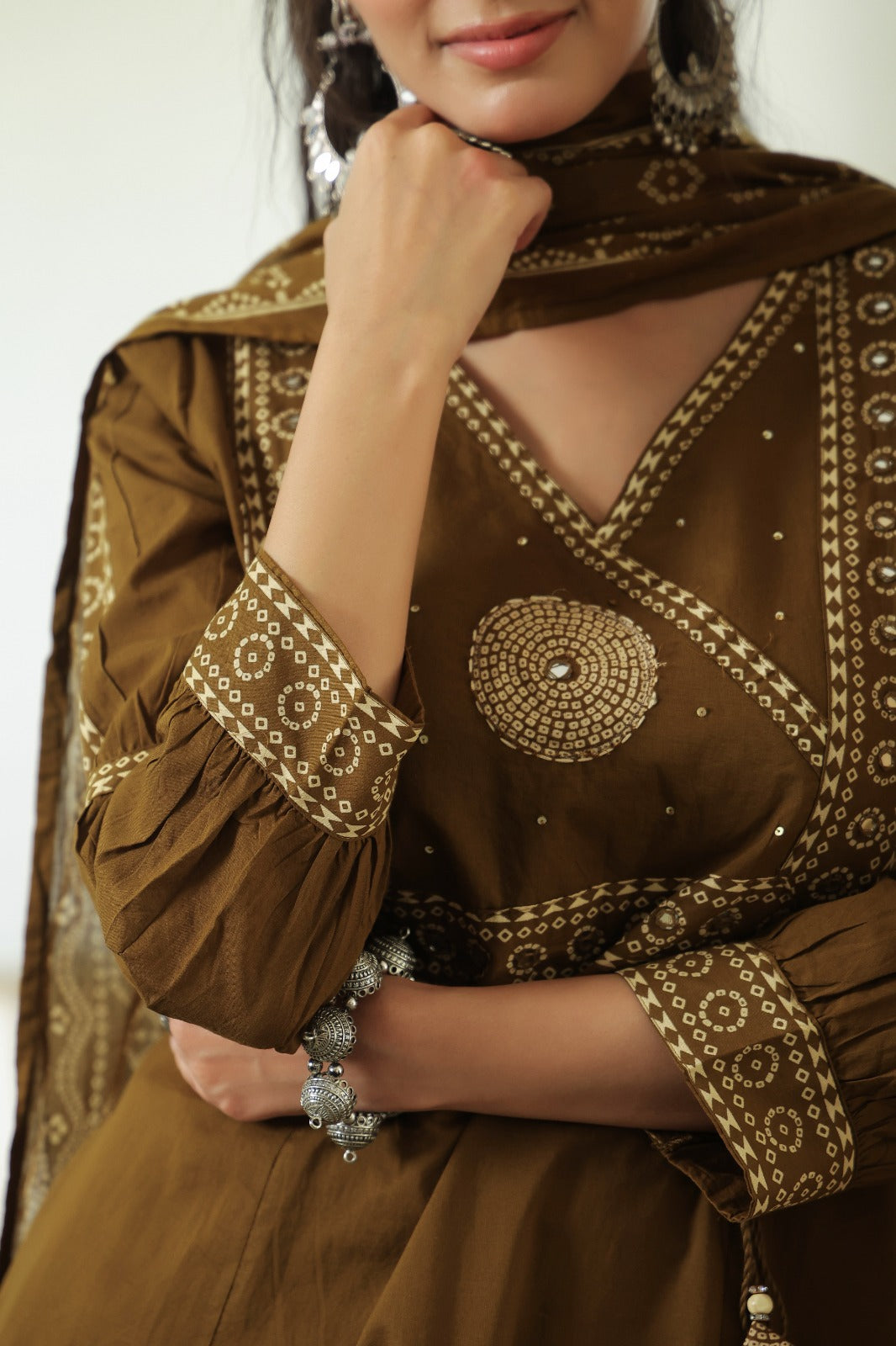 Experience the perfect blend of tradition and comfort with this exquisite Maroon Anarkali set. Crafted from buttery-soft Mul Cotton, this outfit is designed for all-day breathability and ease. The kurta features a flattering V-neckline with delicate border detailing and flares out beautifully with bold, circular ethnic motifs.