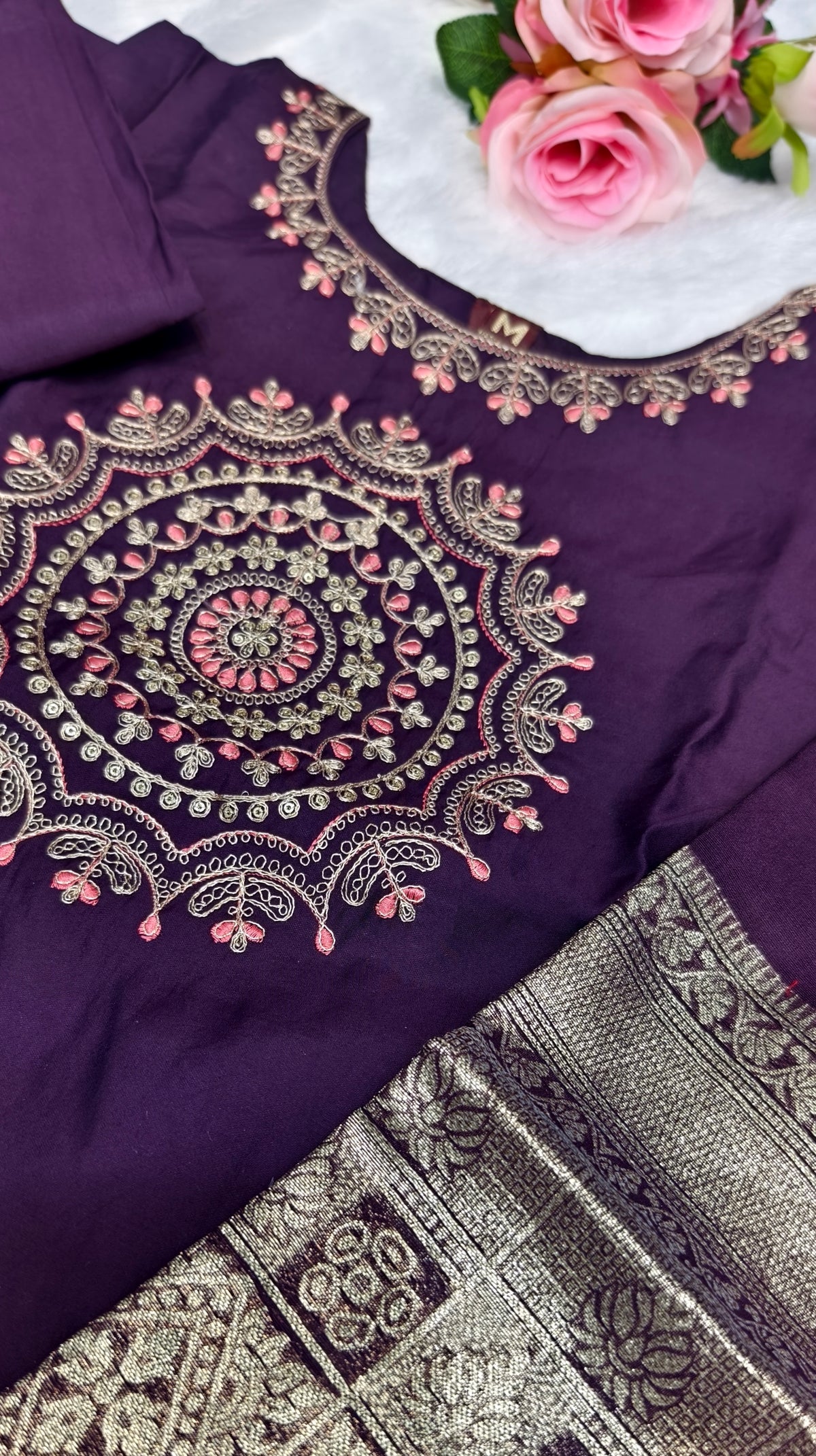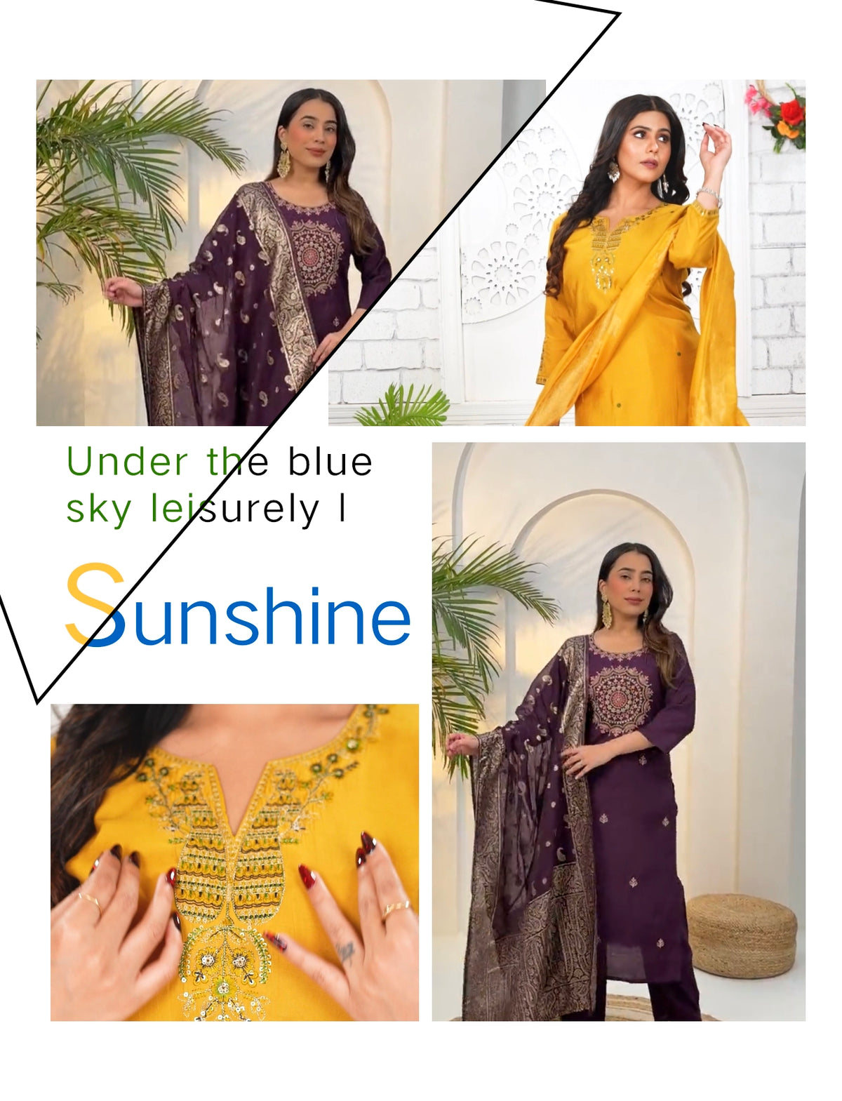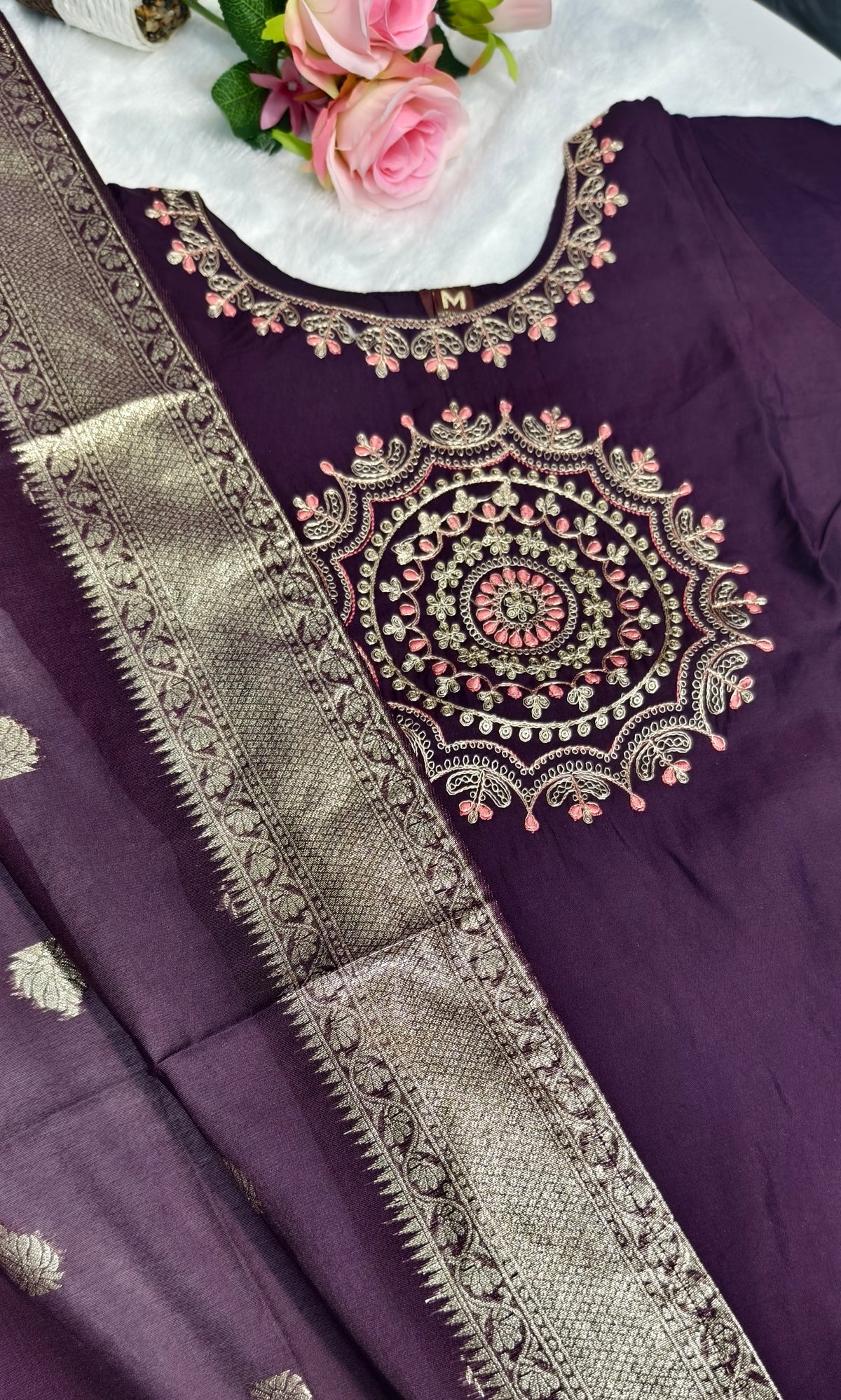 "Draped in the rich hue of deep purple and intricate gold embroidery. This three-piece suit set and the heavy dupatta are a match made in heaven! πŸ’«"