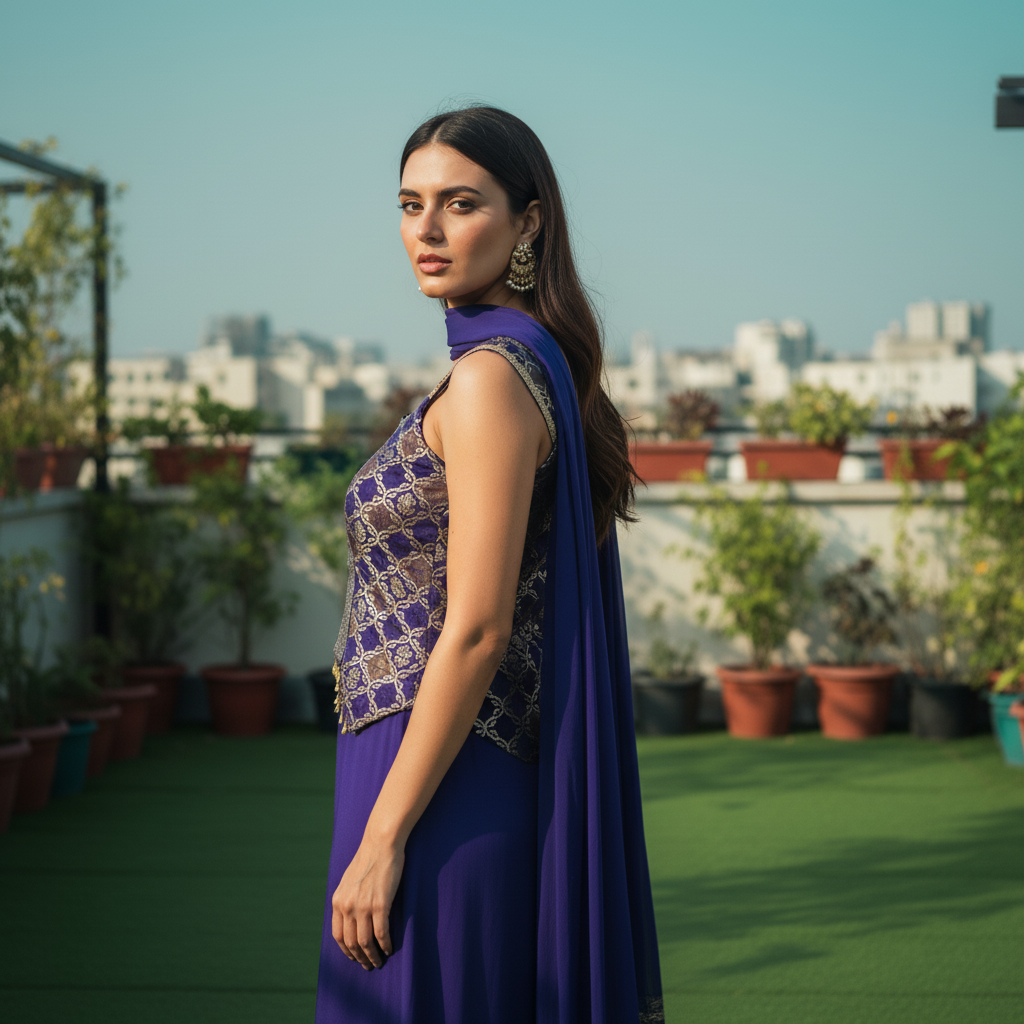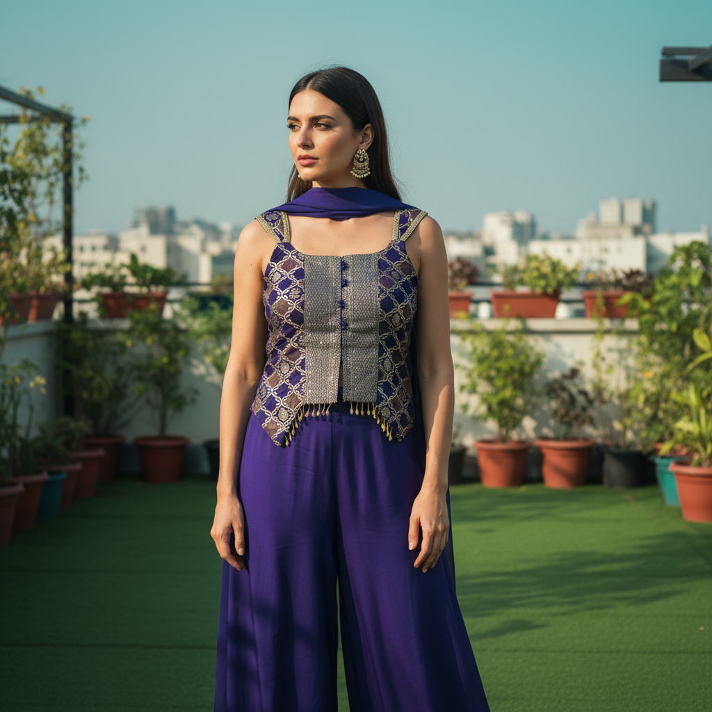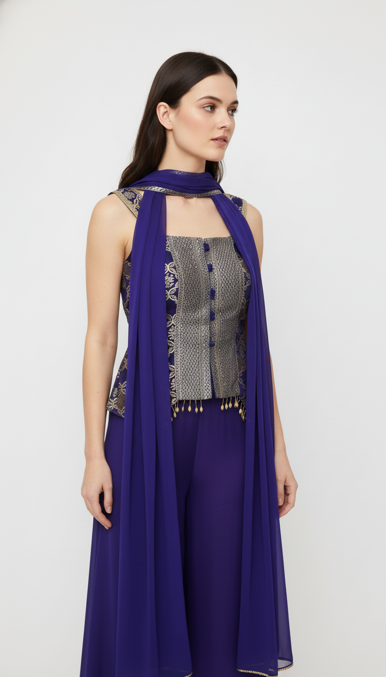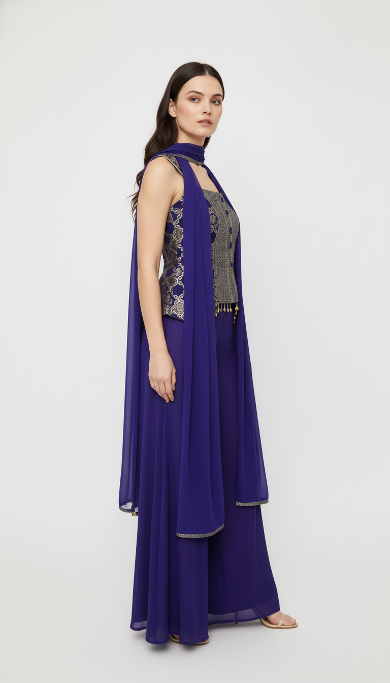 Drape yourself in elegance with this stunning purple sharara suit, a perfect blend of traditional charm and contemporary style. This three-piece ensemble, crafted from a luxurious, flowy fabric like georgette or silk blend, is ideal for making a statement at festive events, weddings, or formal gatherings.