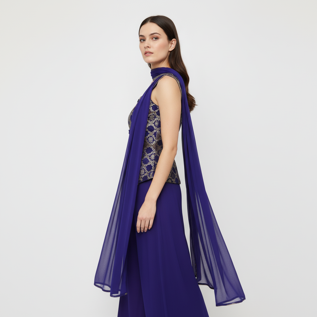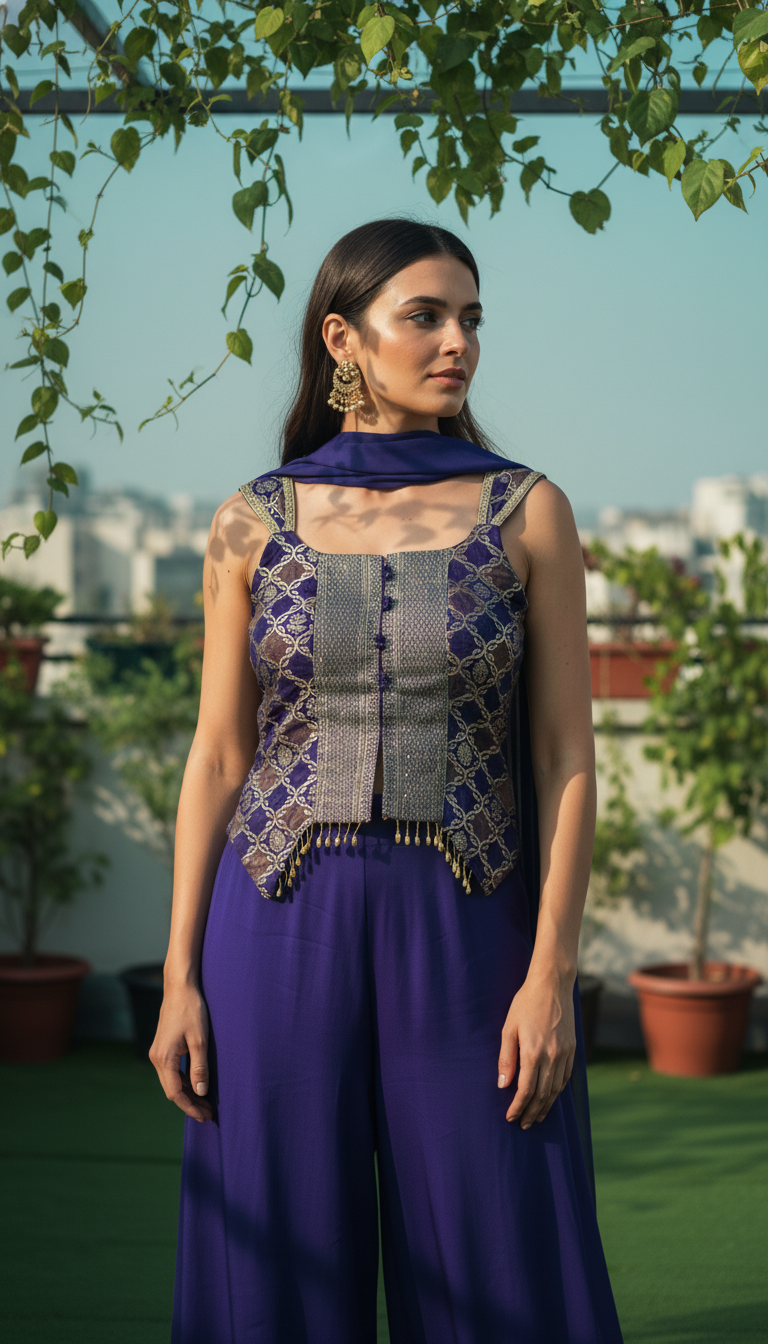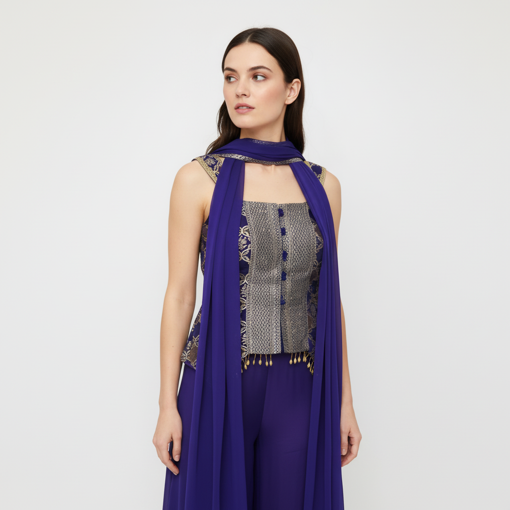 Drape yourself in elegance with this stunning purple sharara suit, a perfect blend of traditional charm and contemporary style. This three-piece ensemble, crafted from a luxurious, flowy fabric like georgette or silk blend, is ideal for making a statement at festive events, weddings, or formal gatherings.