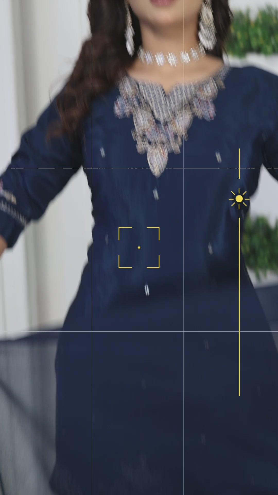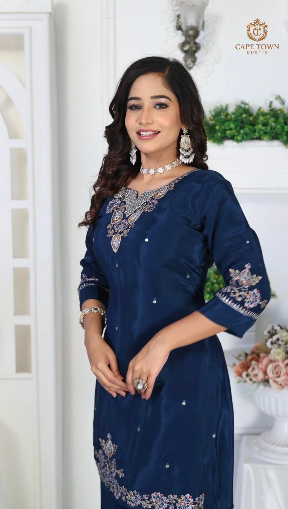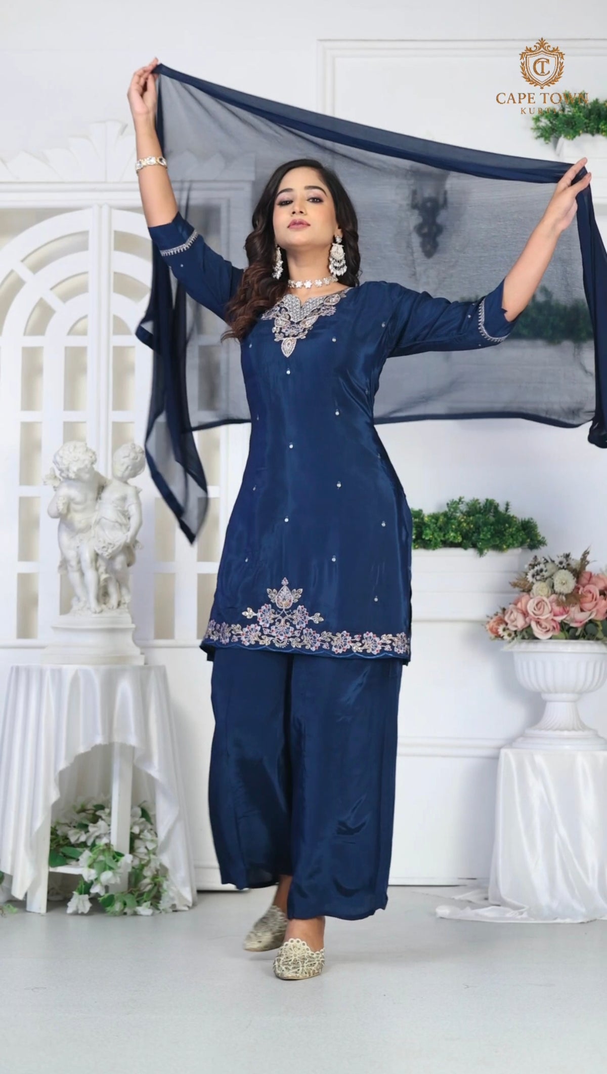 Step into the spotlight with this absolutely stunning royal blue ensemble. Crafted from luxurious silk fabric, this outfit drapes beautifully, offering a regal and elegant silhouette. The straight-cut kurta features exquisite silver thread and stonework embroidery around the neckline and cuffs. It is perfectly paired with flowing plazzo/sharara pants made from the same rich silk. The look is completed with a sheer, matching dupatta. Perfect for weddings, festive occasions, or any event where you want to make a sophisticated statement.