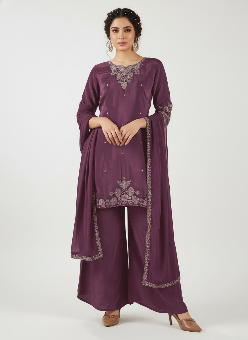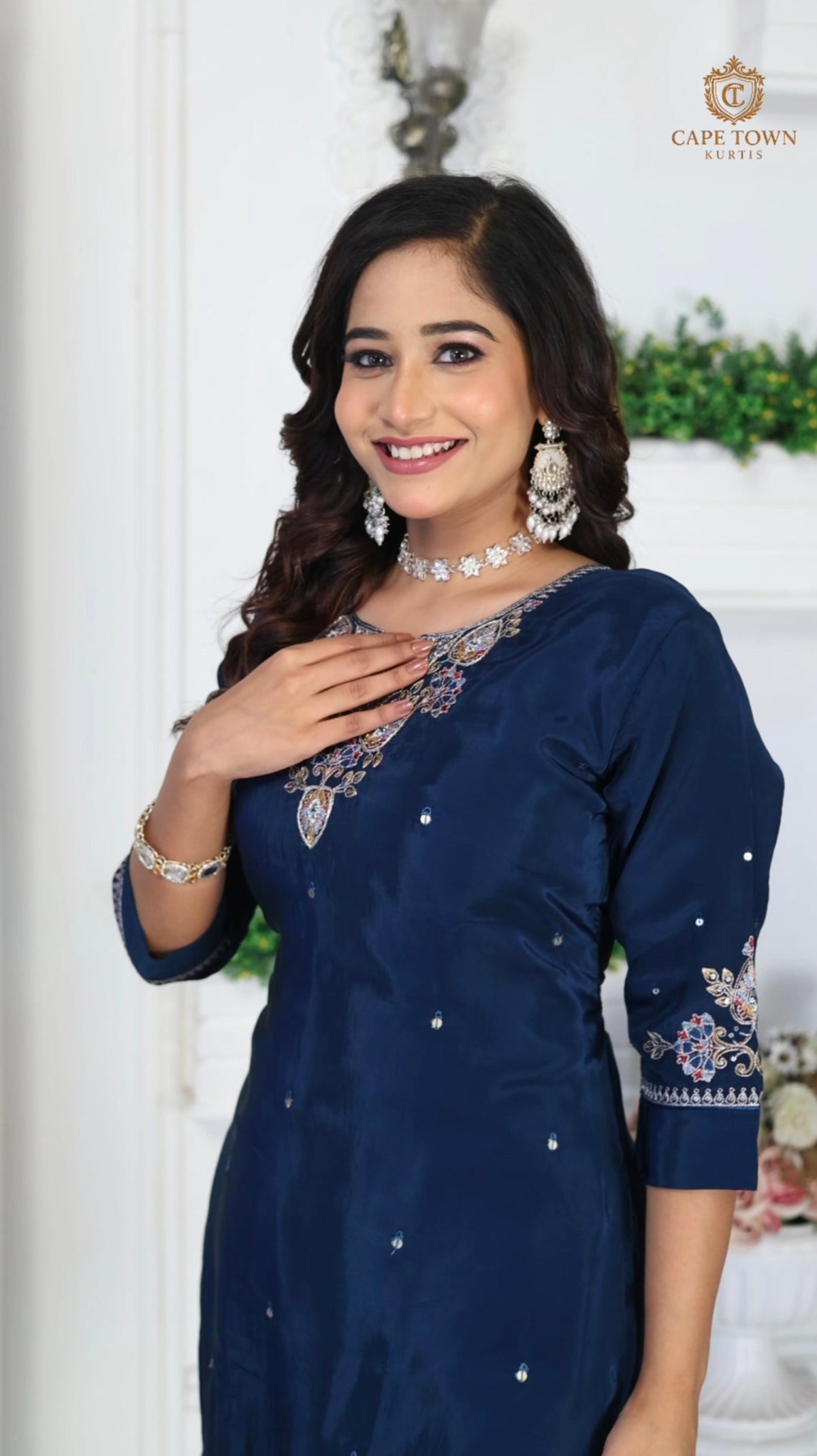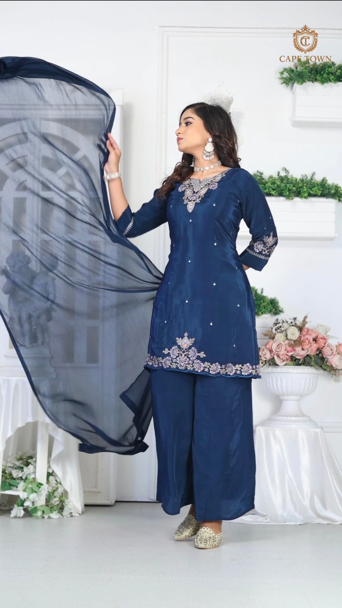 Royal Blue model Silk Plazzo Suit with Intricate Embroidery